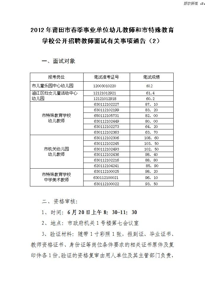 2012年福建省莆田市幼兒教師和市特殊教育學(xué)校公開招聘教師面試有關(guān)事項通告