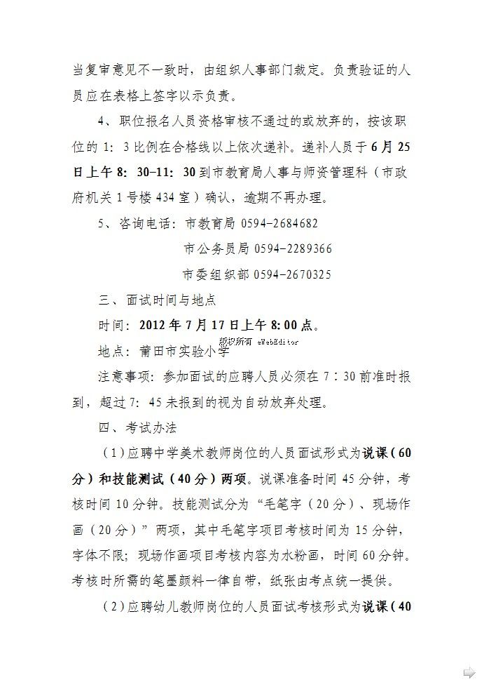 2012年福建省莆田市仙游縣公開招聘新任教師面試方案