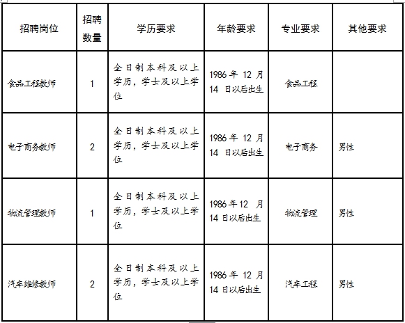 招聘崗位:汽修教師、電子商務(wù)教師、物流管理教師、食品工程教師