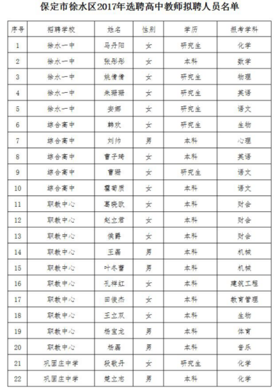 保定市徐水區(qū)2017年選聘高中教師擬聘用人員公示