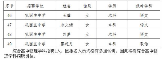 根據(jù)保定市徐水區(qū)教育局、保定市徐水區(qū)人力資源和社會保障局、保定市徐水區(qū)編制委員會辦公室《關(guān)于選聘2017年高中教師的實施方案》,經(jīng)過面試、考察考核、體檢等程序,除綜合高中物理學(xué)科報名人員沒有參加試講取消綜合高中物理招聘崗位1人外,選聘辦依照招聘崗位人數(shù)確定了49名擬聘用人員,現(xiàn)將擬聘用人員名單予以公示。