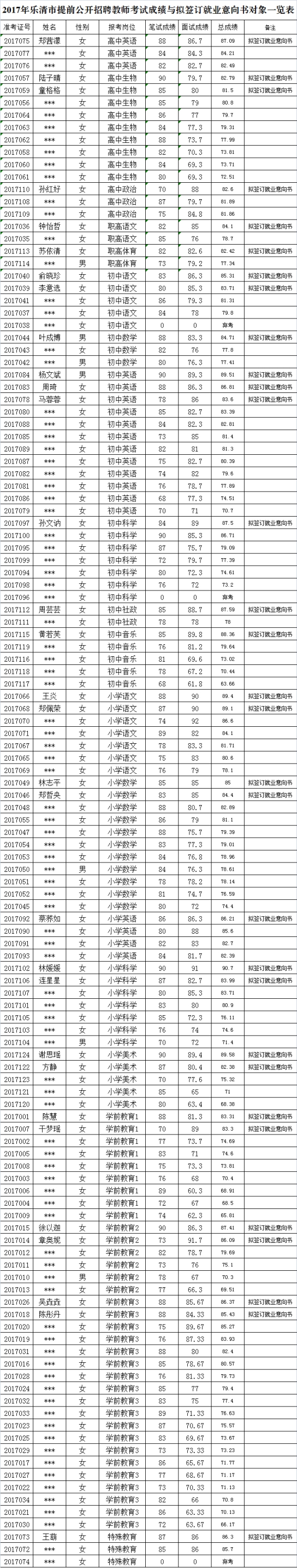 根據(jù)樂清市教育局、樂清市人力資源和社會(huì)保障局《關(guān)于做好2017年提前公開招聘部分中小學(xué)幼兒園教師工作的通知》(樂教政〔2017〕1號(hào))精神,經(jīng)筆試、面試(試課),現(xiàn)將考試成績(jī)成績(jī)與擬簽訂就業(yè)意向書對(duì)象予以公布,具體如下: