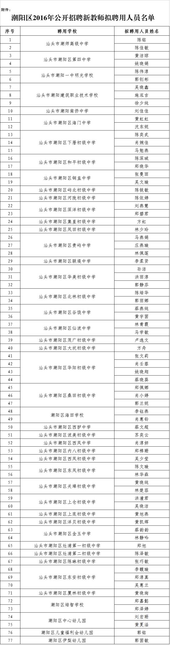 附件:潮陽區(qū)2016年公開招聘新教師擬聘用人員名單