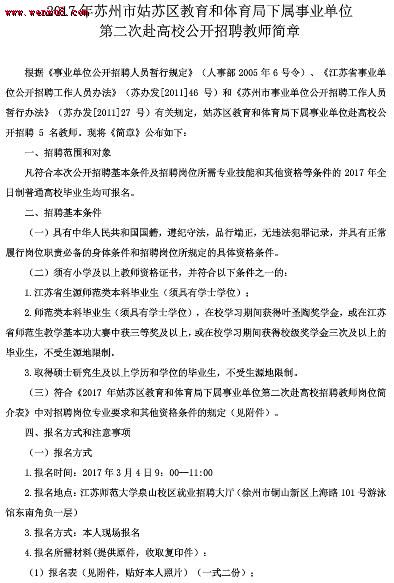 | 2017年蘇州市姑蘇區(qū)教育和體育局下屬事業(yè)單位第二次赴高校公開招聘教師簡章