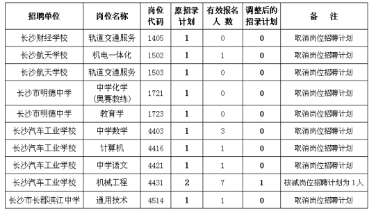 根據(jù)《招聘簡章》的規(guī)定,2017年長沙市教育局直屬單位公開招聘教師報名已于3月28日結(jié)束,按照筆試開考比例1∶4的要求,共有9個招聘崗位被取消、1個崗位需核減招聘計劃數(shù)(詳見下表),現(xiàn)將應(yīng)核減、取消的招聘崗位公告如下。被取消的崗位報考人員報考費將由報名系統(tǒng)退還繳費賬戶。