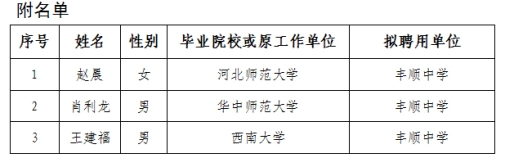 根據(jù)《廣東省事業(yè)單位公開招聘人員辦法》(廣東省人民政府令第139號)和《關于做好我市事業(yè)單位公開招聘工作有關問題的通知》(梅市明電〔2012〕251號)等文規(guī)定,經(jīng)過發(fā)布《2016年豐順縣教育系統(tǒng)公開招聘工作人員的公告》、報名、資格審核、面試、體檢、考察等程序。經(jīng)審核,擬聘用趙晨等3位同志為豐順縣豐順中學教師,現(xiàn)予以公示(附名單)。