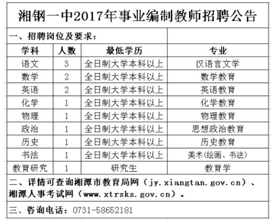 3、湘鋼一中2017年事業(yè)編制教師招聘計(jì)劃。