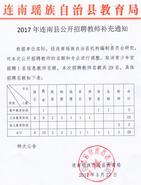 2017年廣東省清遠(yuǎn)市連南縣教師招聘補(bǔ)充通知