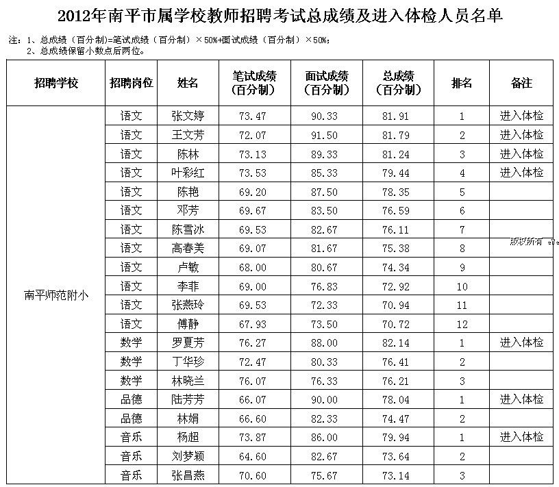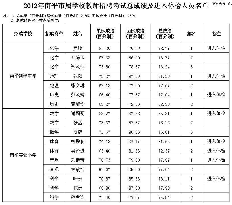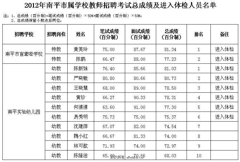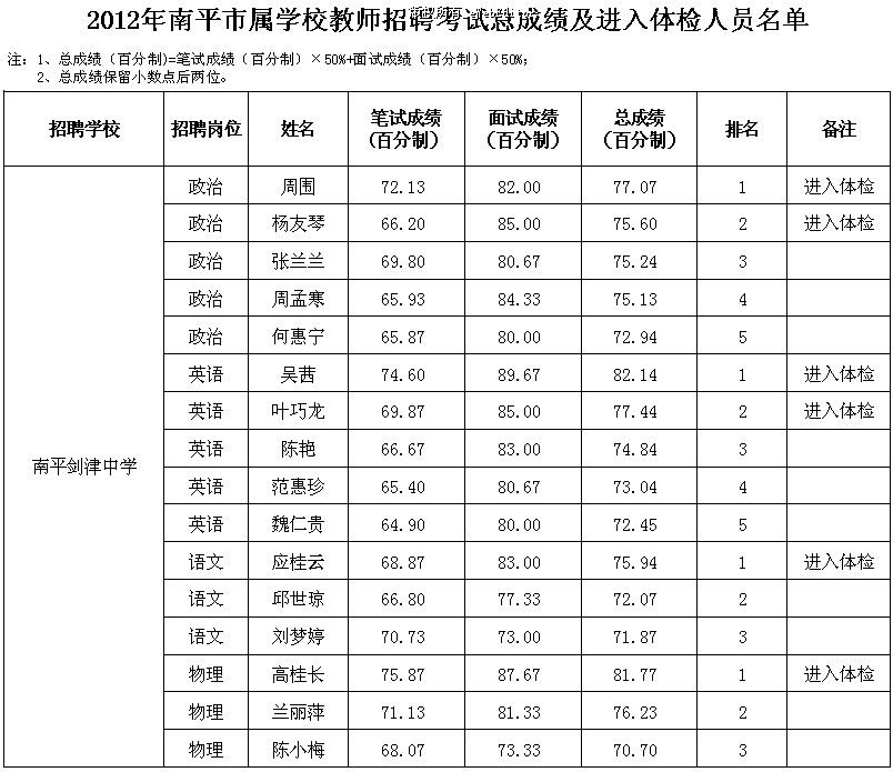 2012年福建省南平市屬學(xué)校教師招聘考試總成績及進(jìn)入體檢人員名單