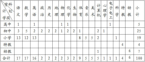 鄂州市2017年市直學(xué)校面向社會(huì)公開招聘教師100人,各學(xué)段學(xué)科招聘崗位如下:
