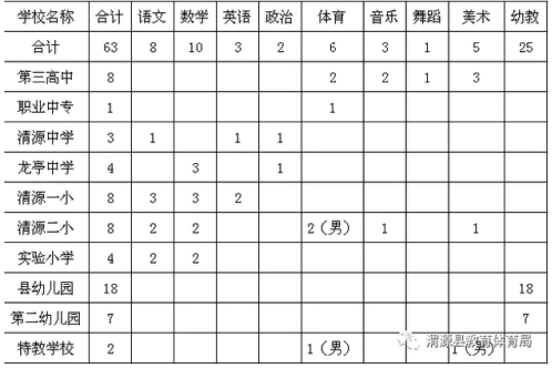 3.小學、特教學校教師面向全縣小學選調(diào),所選調(diào)教師須具有大專以上學歷(初始學歷須為全日制中專以上),語文、數(shù)學教師不限專業(yè),英語、體育、音樂、美術(shù)專業(yè)教師需專業(yè)對口。清源二小體育、特教學校體育、美術(shù)選調(diào)男教師。