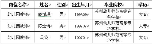 根據(jù)《蘇州市吳中區(qū)定向招聘免費(fèi)幼兒師范男生簡(jiǎn)章》,經(jīng)過筆試、面試、體檢和政審合格,擬錄用以下3名同志,現(xiàn)公示如下: