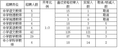 宿遷經(jīng)濟(jì)技術(shù)開發(fā)區(qū)人力資源有限公司于2017年8月7日發(fā)布了《宿遷經(jīng)濟(jì)技術(shù)開發(fā)區(qū)2017年公開招聘中小學(xué)臨時代課教師簡章》,現(xiàn)已完成報名、資格初審工作。根據(jù)招聘公告相關(guān)規(guī)定,同一崗位招聘計劃數(shù)和應(yīng)聘人數(shù)之比須達(dá)到1:3方可開考,現(xiàn)對達(dá)不到此比例的中學(xué)語文等8個崗位取消或核減招聘計劃數(shù)。具體核減招聘計劃人數(shù)如下表。