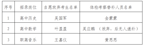 龍灣區(qū)教師招聘工作已進入體檢與考察階段,現(xiàn)有個別考生因個人原因自愿放棄體檢和考察,根據《關于龍灣區(qū)2017年公開招聘教師的公告》(溫龍教人〔2017〕45號)文件的要求,按照綜合成績排名進行依次替補,列入體檢和考察替補考生已通過資格復查,F(xiàn)將自愿放棄考生名單、體檢和考察入圍替補對象進行公布。