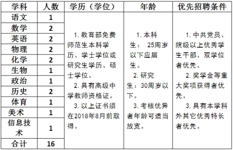 注明: 1、經(jīng)我?己撕细竦膽溉藛T即可簽訂就業(yè)協(xié)議書,應聘者帶上三方協(xié)議書。 2、經(jīng)體檢合格后按直接考核引進人才程序辦理占編等 有關手續(xù)。 3、所聘用人員均從事高中教學工作。 4、招聘地點及時間: 地點:西南大學招就處圓頂報告廳 時間:2017年10月11日(星期三)上午11:00