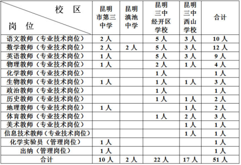 為進(jìn)一步滿足人民群眾享受優(yōu)質(zhì)教育的需要,昆明市第三中學(xué)、昆明滇池中學(xué)、昆明三中經(jīng)開區(qū)學(xué)校、昆明三中西山學(xué)校特向省內(nèi)外招聘能勝任優(yōu)質(zhì)名牌學(xué)校教育教學(xué)工作的畢業(yè)生及相關(guān)工作人員,招聘人員均可享有事業(yè)單位正式編制,F(xiàn)將有關(guān)事宜公告如下: