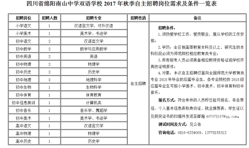 附件:四川省綿陽南山中學(xué)雙語學(xué)校2017年秋季自主招聘崗位需求及條件一覽表
