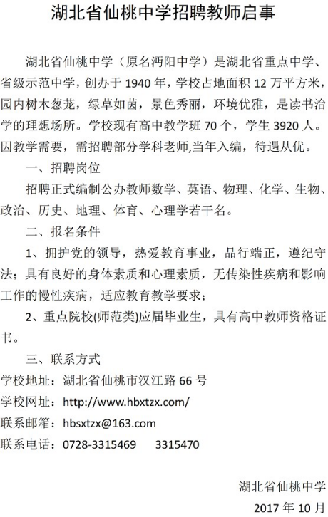 湖北省仙桃中學(xué)2017年教師招聘啟事