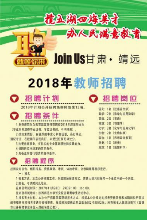 甘肅省白銀市靖遠縣教育局 招聘時間:2017年11月28日8:00 招聘地點:陜西師范大學(xué)長安校區(qū)新勇學(xué)生活動中心