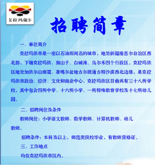 新疆克拉瑪依市教育系統(tǒng)(小學(xué)、幼兒園)專場(chǎng)招聘