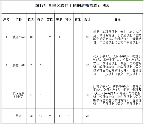 招聘編外聘用教師40名。其中:城區(qū)小學(xué)20名,鄉(xiāng)鎮(zhèn)小學(xué)20名。(招聘學(xué)科計(jì)劃等詳見附表1)。