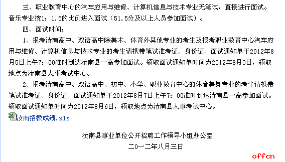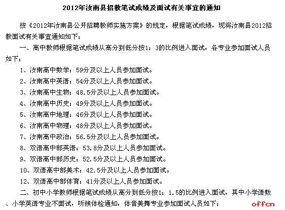 2012年河南省駐馬店市汝南縣招教筆試成績及面試有關(guān)事宜的通知