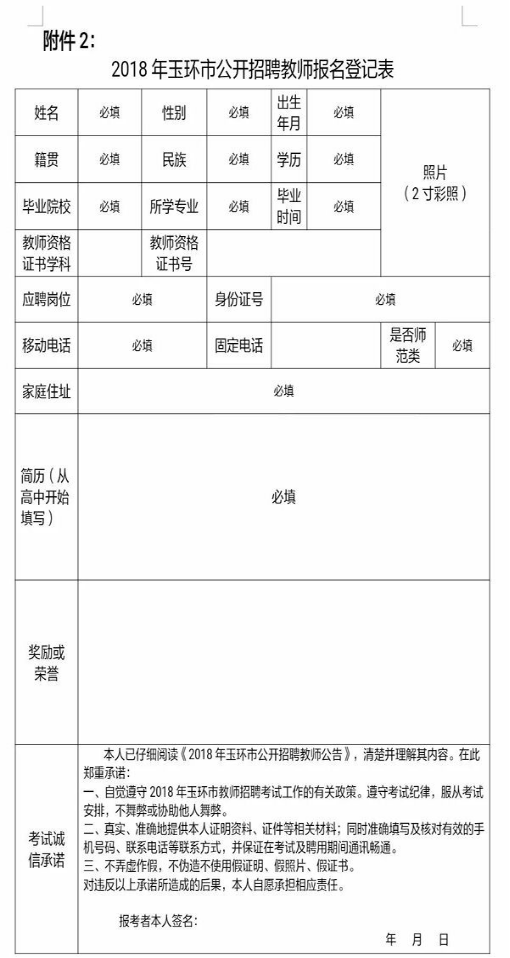(1)《2018年玉環(huán)市公開招聘教師報名登記表》(見附件2,網(wǎng)上報名后直接打印)。