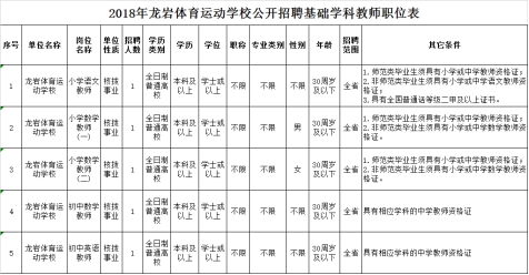 2018年龍巖體育運動學(xué)校公開招聘基礎(chǔ)學(xué)科教師職位表 (單擊左側(cè)鏈接可下載)