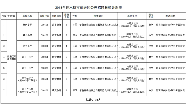 本次計劃招聘小學教師20人,具體招聘崗位、人數(shù),詳見《2018年佳木斯市前進區(qū)公開招聘教師計劃表》。