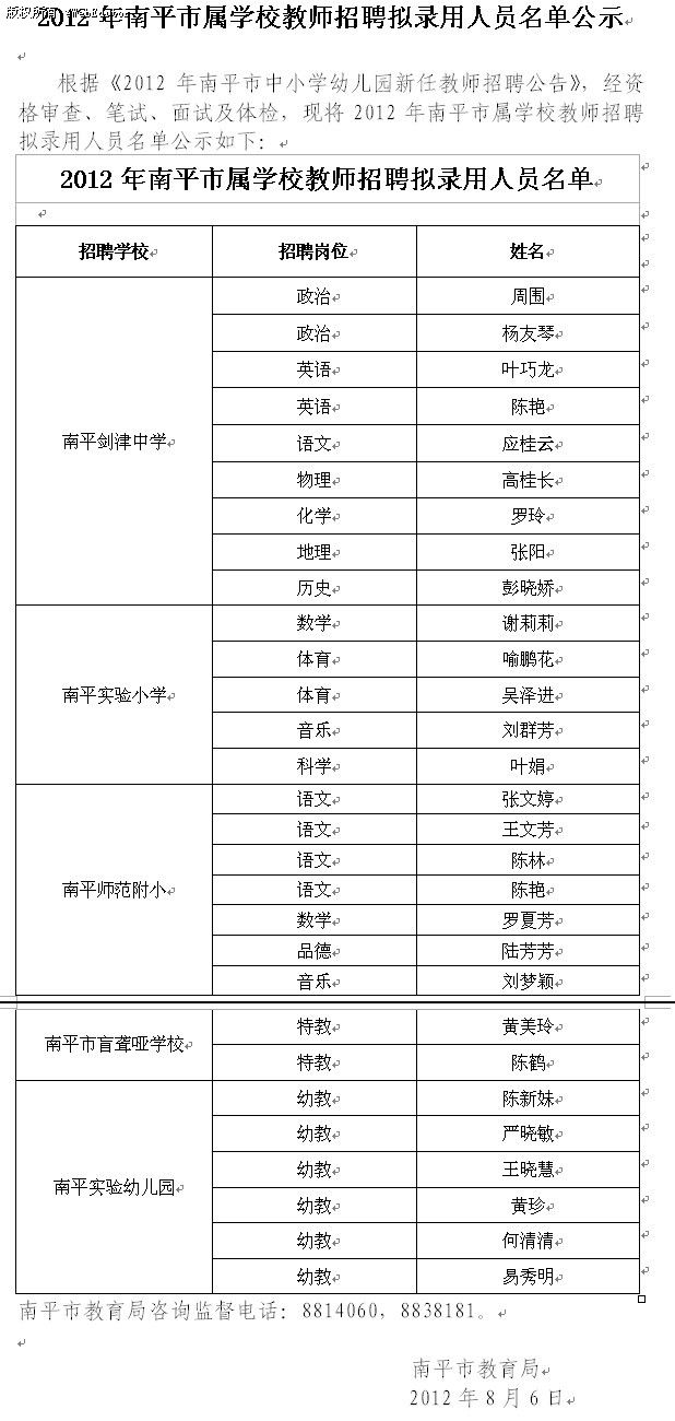 2012年福建省南平市屬學(xué)校教師招聘擬錄用人員名單公示