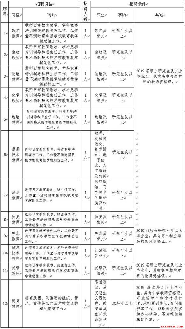 我校2019年擬招聘專業(yè)技術(shù)人員共12名,其中數(shù)學(xué)教師、生物教師、物理教師、化學(xué)教師、地理教師、通用技術(shù)教師、政治教師、歷史教師、美術(shù)教師、信息技術(shù)教師、英語教師、德育教師各1人。