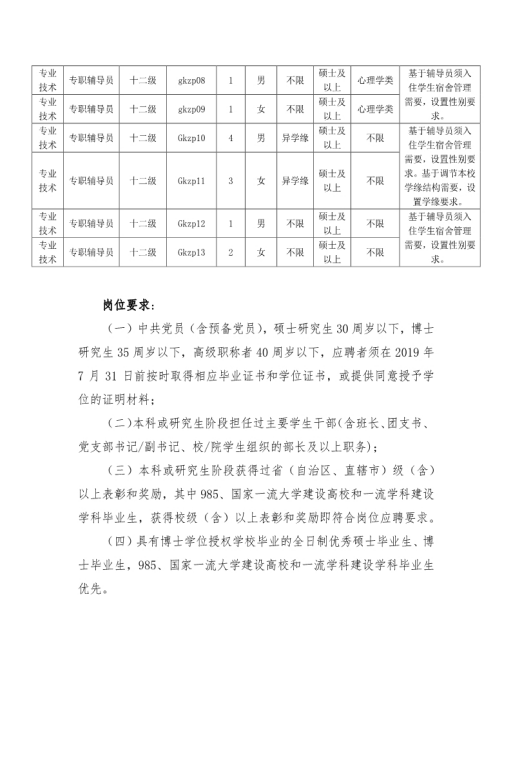 為全面貫徹全國高校思想政治工作會議和全國教育大會精神,落實《中共中央 國務(wù)院關(guān)于加強和改進新形勢下高校思想政治工作的意見》《高校思想政治工作質(zhì)量提升工程實施綱要》《普通高等學(xué)校輔導(dǎo)員隊伍建設(shè)規(guī)定》(教育部第43號令)《學(xué)校招收和培養(yǎng)國際學(xué)生管理辦法》(教育部、外交部、公安部第42號令)等文件精神,加強我校專職輔導(dǎo)員隊伍建設(shè),經(jīng)學(xué)校研究,決定面向社會公開招聘2019年計劃使用的專職輔導(dǎo)員,現(xiàn)將有關(guān)招聘事宜公告如下: