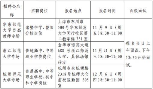 校園招聘工作由諸暨市教育局在諸暨市人才工作領(lǐng)導(dǎo)小組辦公室、人力資源和社會保障局、派駐教育局紀(jì)檢監(jiān)察組等職能部門的監(jiān)督指導(dǎo)下開展。對符合條件的 2019 年應(yīng)屆高校優(yōu)秀畢業(yè)生,通過現(xiàn)場資格審核、現(xiàn)場面談和面試,擇優(yōu)現(xiàn)場簽約預(yù)錄用。諸暨市教育局面向 2019 年高校應(yīng)屆優(yōu)秀畢業(yè)生校園招聘會專場地點分別設(shè)在華東師范大學(xué)、浙江師范大學(xué)、杭州師范大學(xué)。