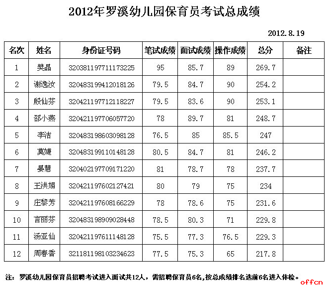 2012年江蘇省常州市高新區(qū)羅溪幼兒園保育員考試總成績公示