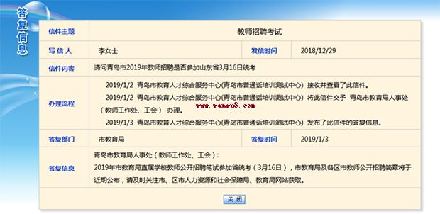 信件內(nèi)容:請(qǐng)問青島市2019年教師招聘是否參加山東省3月16日統(tǒng)考