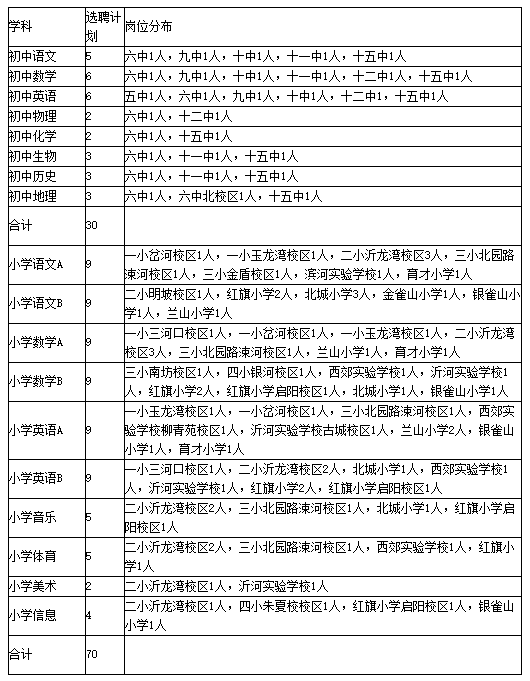 本次選聘計劃共100名(其中初中教師30名,小學(xué)教師70名,具體選聘崗位計劃見附件1)。