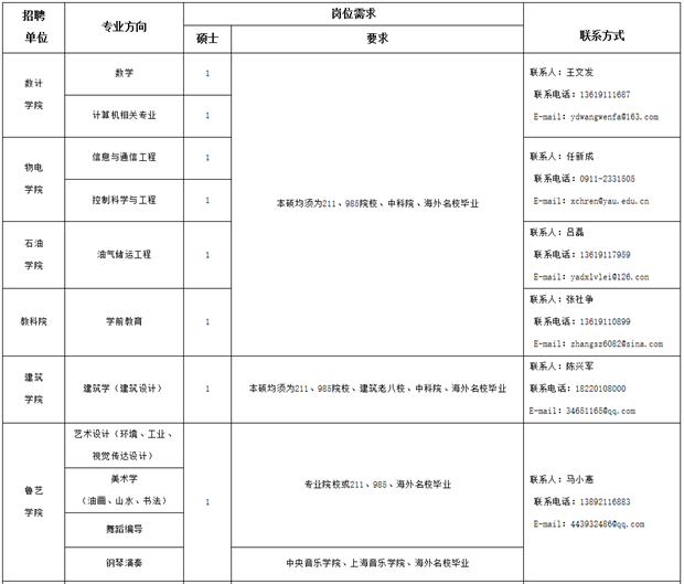 (1)單位電子郵箱:見《延安大學(xué)2019年教師崗位招聘公告(二)》中的崗位需求計劃表。