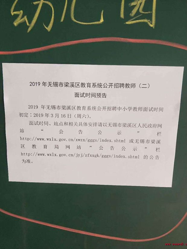 | 2019年無錫市梁溪區(qū)教育系統(tǒng)公開招聘中小學教師面試時間初定:209年3月16日(星期六)。 面試時間、地點和相關具體安排請以無錫市梁溪區(qū)人民政府網(wǎng)站“公告公示”欄http://www.wxlx.gov.cn/jyj/zfxxgk/gggs/index.shtml 或無錫市梁溪區(qū)教育局網(wǎng)站“公告公示”欄http://www.wxlx.gov.cn/xwzx/gggs/index.shtml的公告為準。