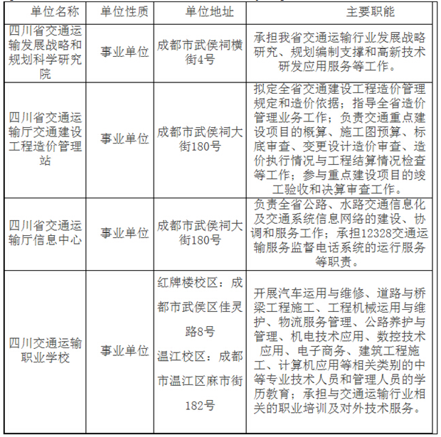 根據(jù)《事業(yè)單位人事管理?xiàng)l例》、《事業(yè)單位公開招聘人員暫行規(guī)定》和《四川省省屬事業(yè)單位公開招聘工作人員實(shí)施細(xì)則(試行)》等有關(guān)規(guī)定,四川省交通運(yùn)輸廳擬面向社會(huì)公開招聘部分工作人員補(bǔ)充到四川省交通運(yùn)輸發(fā)展戰(zhàn)略和規(guī)劃科學(xué)研究院等4個(gè)直屬事業(yè)單位工作,F(xiàn)將公開招聘有關(guān)事項(xiàng)公告如下(本公告由四川省交通運(yùn)輸廳同時(shí)在四川省人力資源和社會(huì)保障廳官網(wǎng)[www.sc.hrss.gov.cn,下同]“人事考試”專欄和四川省交通運(yùn)輸廳網(wǎng)站[jtt.sc.gov.cn,下同]上發(fā)布)。