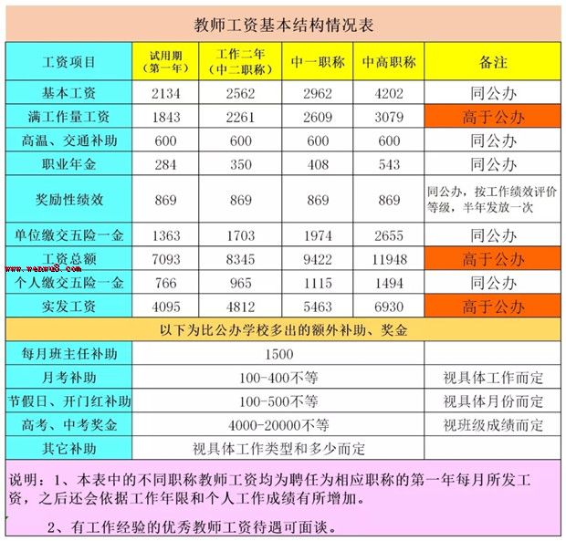 說明:我校教師基本工資和績效工資均按瓊海市公辦學(xué)校教師基本工資標(biāo)準(zhǔn)發(fā)放,比公辦教師多出部分工資包括部分工作量工資、班主任補(bǔ)助、月考補(bǔ)助、中高考獎(jiǎng)金、節(jié)假日補(bǔ)助等等。(詳細(xì)情況見附表)