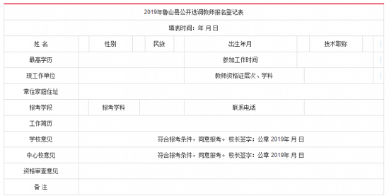 填寫《2019年魯山縣公開選調教師報名登記表》(見附件),學校、鄉(xiāng)鎮(zhèn)中心校進行初步審核,符合報考條件的,在登記表上簽署“符合報考條件,同意報考”字樣,校長簽名并加蓋公章。