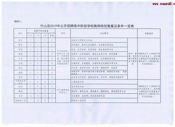 1.竹山縣2019年公開招聘高中階段學(xué)校教師崗位數(shù)量及條件一覽表