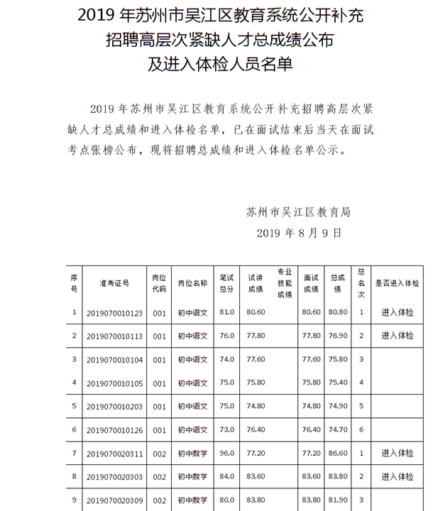 2019蘇州市吳江區(qū)教育系統(tǒng)公開補(bǔ)充招聘高層次緊缺人才總成績公布及進(jìn)入體檢人員名單