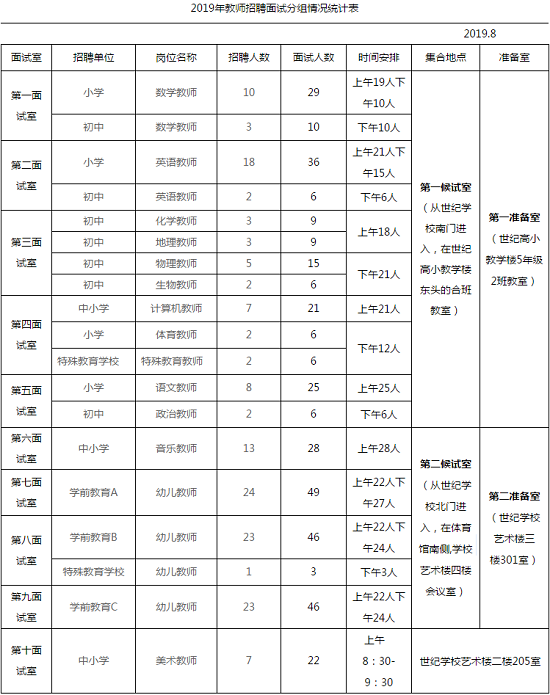 其他崗位從南門(mén)進(jìn)入,到右側(cè)世紀(jì)高小教學(xué)樓一樓東頭合班教室集合。各學(xué)科對(duì)應(yīng)的候試室、準(zhǔn)備室、面試室、休息室請(qǐng)?zhí)崆坝浝。詳情?jiàn)附件《2019年教師招聘面試分組情況統(tǒng)計(jì)表》。