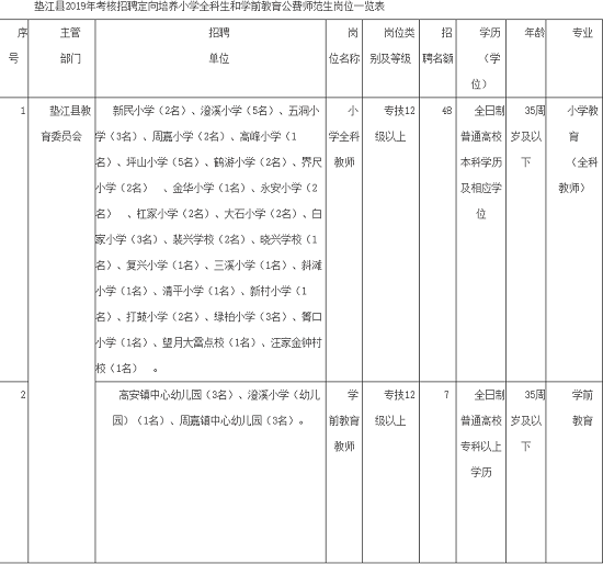 具體招聘崗位及人數(shù)詳見《墊江縣2019年考核招聘定向培養(yǎng)小學全科生和學前教育公費師范生崗位一覽表》(詳見附件,以下簡稱《一覽表》)。