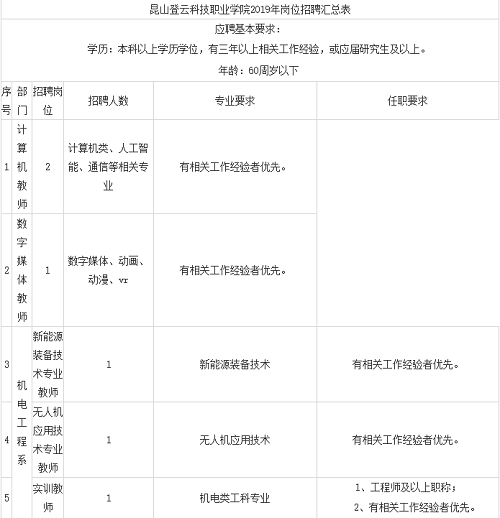 詳見附件1:昆山登云科技職業(yè)學院2019年人才引進計劃表(附后)
