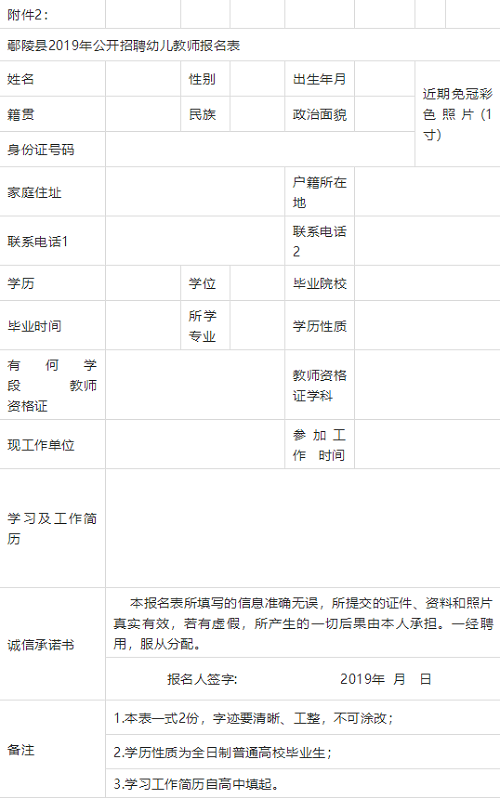 2、鄢陵縣2019年公開招聘幼兒教師報名表