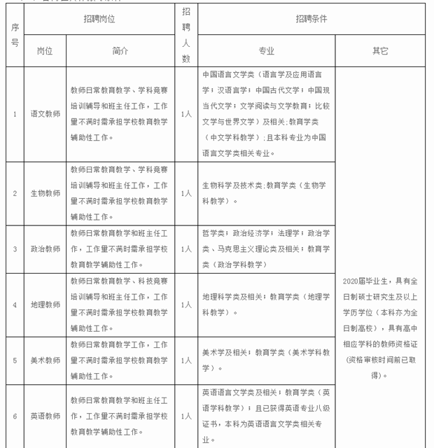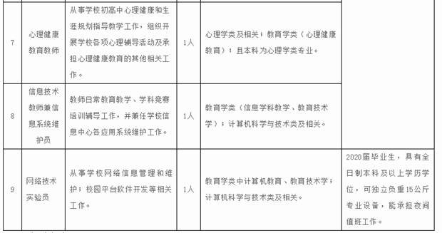 我校2020年擬招聘專業(yè)技術人員共9名,其中語文教師、生物教師、政治教師、地理教師、美術教師、英語教師、心理健康教育教師、信息技術教師兼信息系統(tǒng)維護員、網(wǎng)絡技術實驗員各1人。