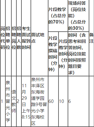 此次專項招聘所有崗位考試采取面試的方式進行的,所有崗位均無加分人員。綜合成績=面試成績(實行百分制,其中片段教學占70%、現(xiàn)場問答占30%)。面試成績合格線為70分。未達到合格分數(shù)線的考生將不予確定為體檢、考察對象。面試主要測試應考對象的專業(yè)知識和業(yè)務能力等,采取片段教學、現(xiàn)場問答等形式進行?荚嚨木唧w形式、內(nèi)容和時間如下: