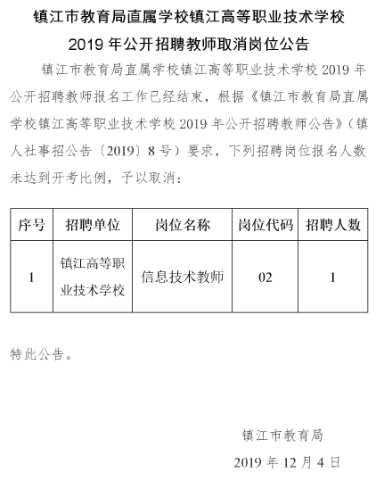 江蘇教師招聘 鎮(zhèn)江市教育局直屬學(xué)校鎮(zhèn)江高等職業(yè)技術(shù)學(xué)校2019年公開招聘教師取消崗位公告